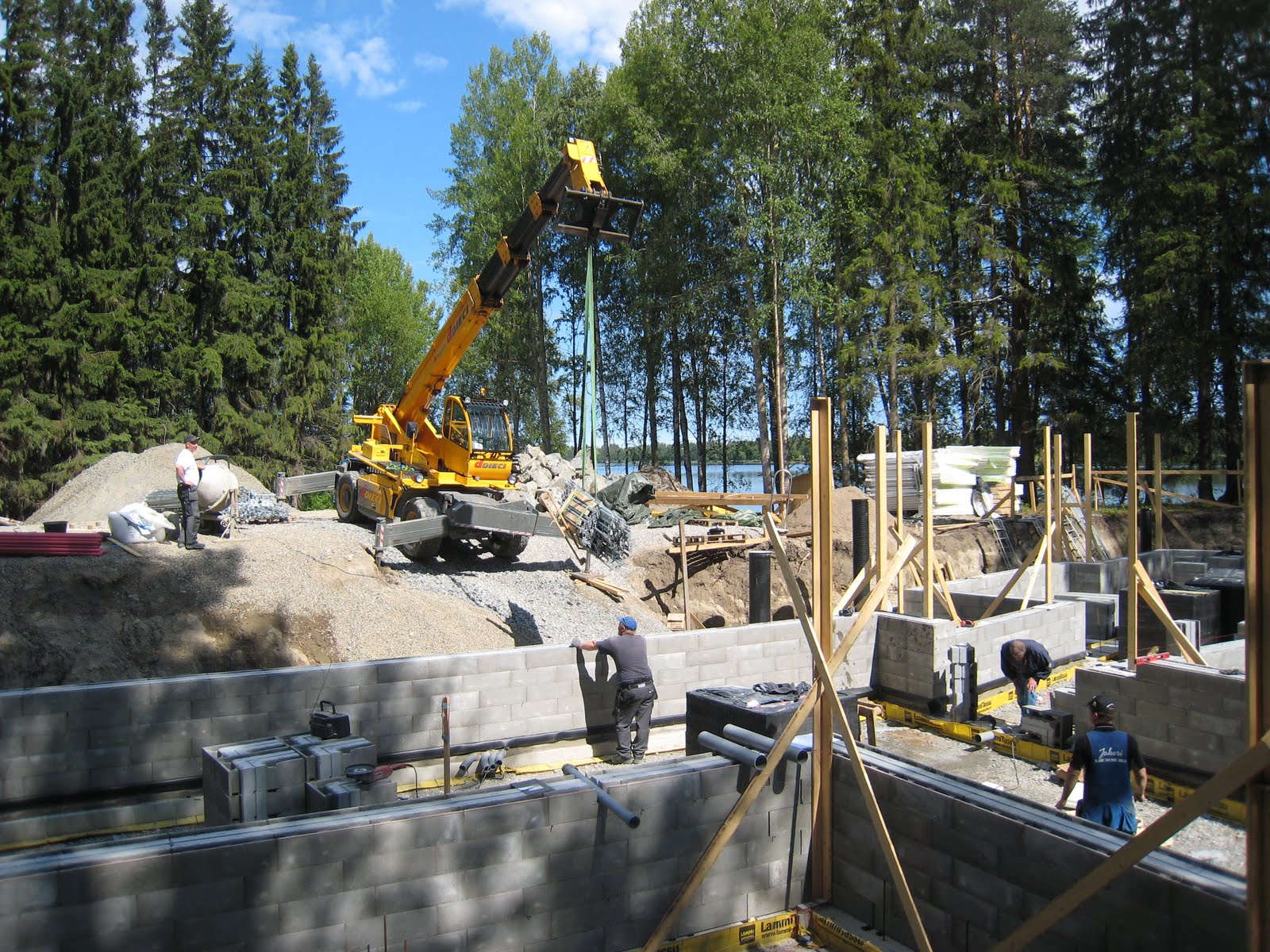 Tontille paluu, telineitä jo alkaa pukata. Kurottaja hommissa, tänään tuli rekkaa Lammilta ja Peikolta. Eka seinävalu to klo 14.